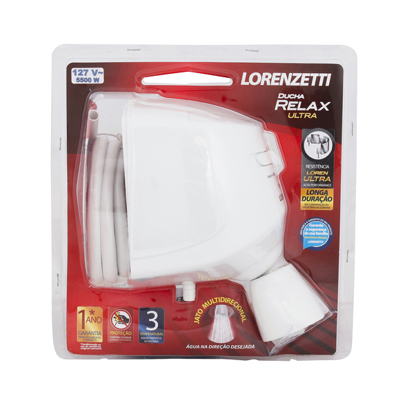 Chuveiro Elétrico Relax, da Lorenzetti Praticidade e muito conforto para a hora do seu banho! Indispensável para o banho: O banho é uma etapa fundamental da higiene diária. Nada melhor do que ter esse momento com muito conforto e utilizar esse tempo para relaxar e renovar as energias após um dia de trabalho, por exemplo. Por esse motivo, a Lorenzetti desenvolveu o Chuveiro Elétrico Relax, um modelo multitemperatura que oferece 3 opções de temperatura para você ter o seu banho agradável em qualquer estação do ano! Funcional: O Chuveiro Elétrico Relax, da Lorenzetti, foi projetado para aumentar ainda mais o seu bem-estar. Por isso, esse modelo é muito prático e funcional, com instalação direta na parede. Ele funciona com tensão elétrica de 127 V (110 V) e potência 5500 W. Ademais, muito econômico, tem o consumo de energia de 22,7 KWh/ mês! Alto durabilidade: Além da durabilidade, uma propriedade garantida pela qualidade do material de sua fabricação, que é o plástico, esse Chuveiro Elétrico Relax, da Lorenzetti tem alta pressão. A pressão de funcionamento desse modelo varia de 1 até 40 mca, com vazão de 5 L/ min. Esse modelo é a garantia de um banho quentinho e confortável! Ter um chuveiro potente e multitemperatura ficou muito fácil! O Chuveiro Elétrico Relax, da Lorenzetti, proporciona um banho adequado para cada estação do ano! Esse modelo multitemperatura oferece 3 opções de temperatura, ele funciona com tensão elétrica de 127 V (110 V) e oferece um consumo de energia mensal de apenas 22,7 KWh/ mês! Ele deve ser instalado na parede, tem fiação mínima de 10 mm. Esse produto tem a cor branca e a composição é feita de plástico. Gostou do Chuveiro Elétrico Relax, da Lorenzetti? Então, você também vai gostar de saber: O fabricante oferece 12 meses de garantia para defeitos de fabricação. O conteúdo da embalagem é 1 mangueira, 1 ducha manual, 1 suporte da ducha manual e 1 manual de instruções; Precisa apenas de pano úmido para a limpeza