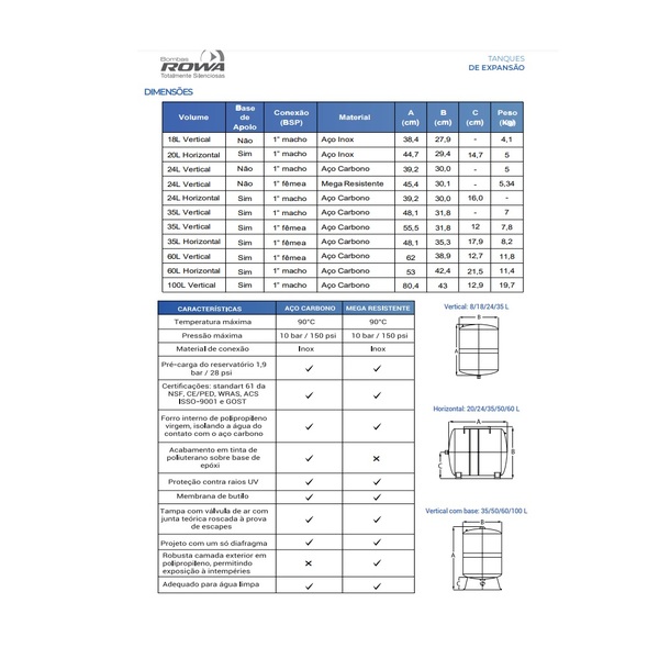 Tanque de expansão 20l horizontal aço carbono os tanques de expansão rowa são especialmente indicados para uma ampla gama de aplicações, incluindo os sistemas booster, expansão térmica, sistemas de irrigação, e absorção do golpe de aríete (golpe hidráulico)